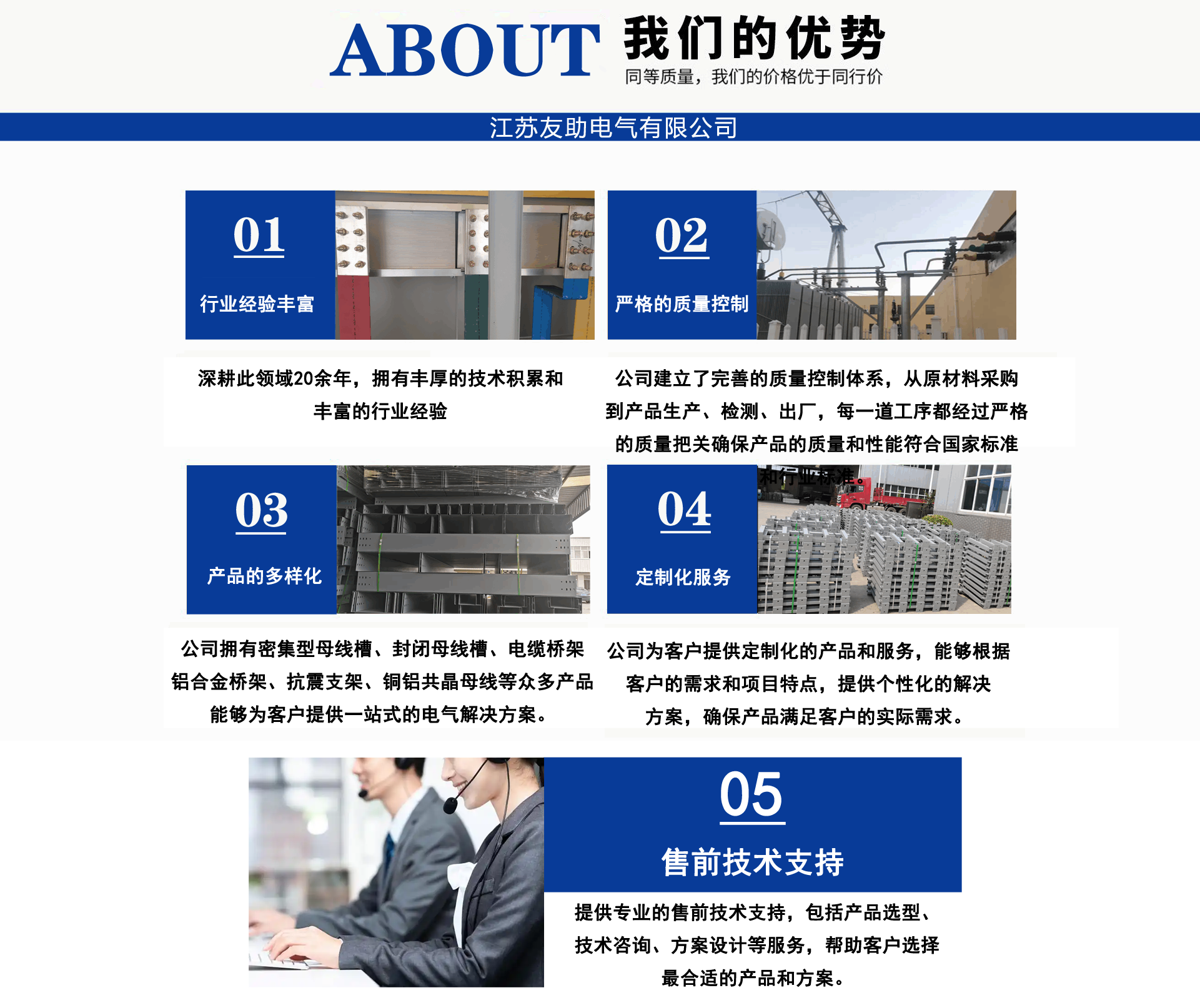 江蘇友助電氣有限公司地處中國工程電氣生產基地-一江蘇省揚中市。經營范圍:電纜橋架,母線槽(橋),管型母線,銅軟連接(伸縮節),高低壓開關柜,配電箱,抗震支架產品系列。 公司宗旨:客戶至上。已成功為江蘇二十屆省運會會場-泰州體育館,南京寶龍商業綜合體,張家口百兆瓦風電場,濟源市婦幼醫院,威海市未來科技園,湖北皇恩燁新材料科技有限公司,南京中央路小學,南通中天大酒店,新疆新安特鋼有限公司,河北省送變電有限公司,南京南微醫學研發基地等多項工程配套服務,我們愿與您精誠合作,互利共贏!公司技術人員深耕橋架,母線領域30年,為您提供橋架,母線槽疑難問題解決方案。母線槽不論每相是單排,雙排,三根排重疊,不管有多少個水平彎、垂直彎,轉接排在發貨前預裝一遍,確保尺寸無誤。到現場直接擰螺絲,效率高,橫平豎直,規規矩矩,符合標準,供電局,業主,監理,驗收易通過。供貨周期3-7天。為了讓尊貴客戶您,設備安全通電,高枕無憂。我們提供如下售前售中售后服務: 售前:免費技術支持,咨詢?!∈壑?免費現場精確測繪、設計?!∈酆?安裝服務,免費指導?!≠|量是生命,客戶是源泉。承諾客戶的,一定全力做到。讓我們一起進步!...